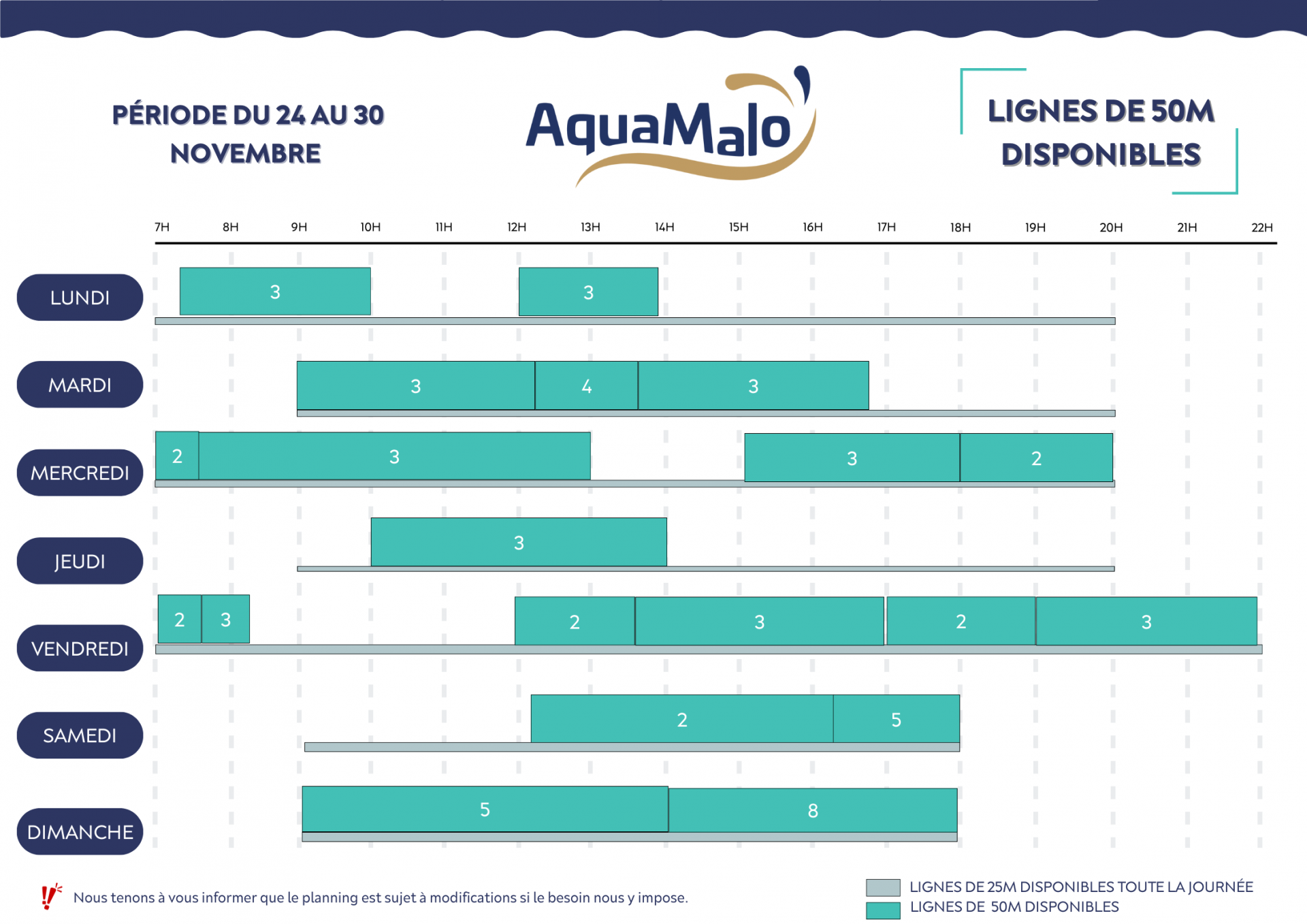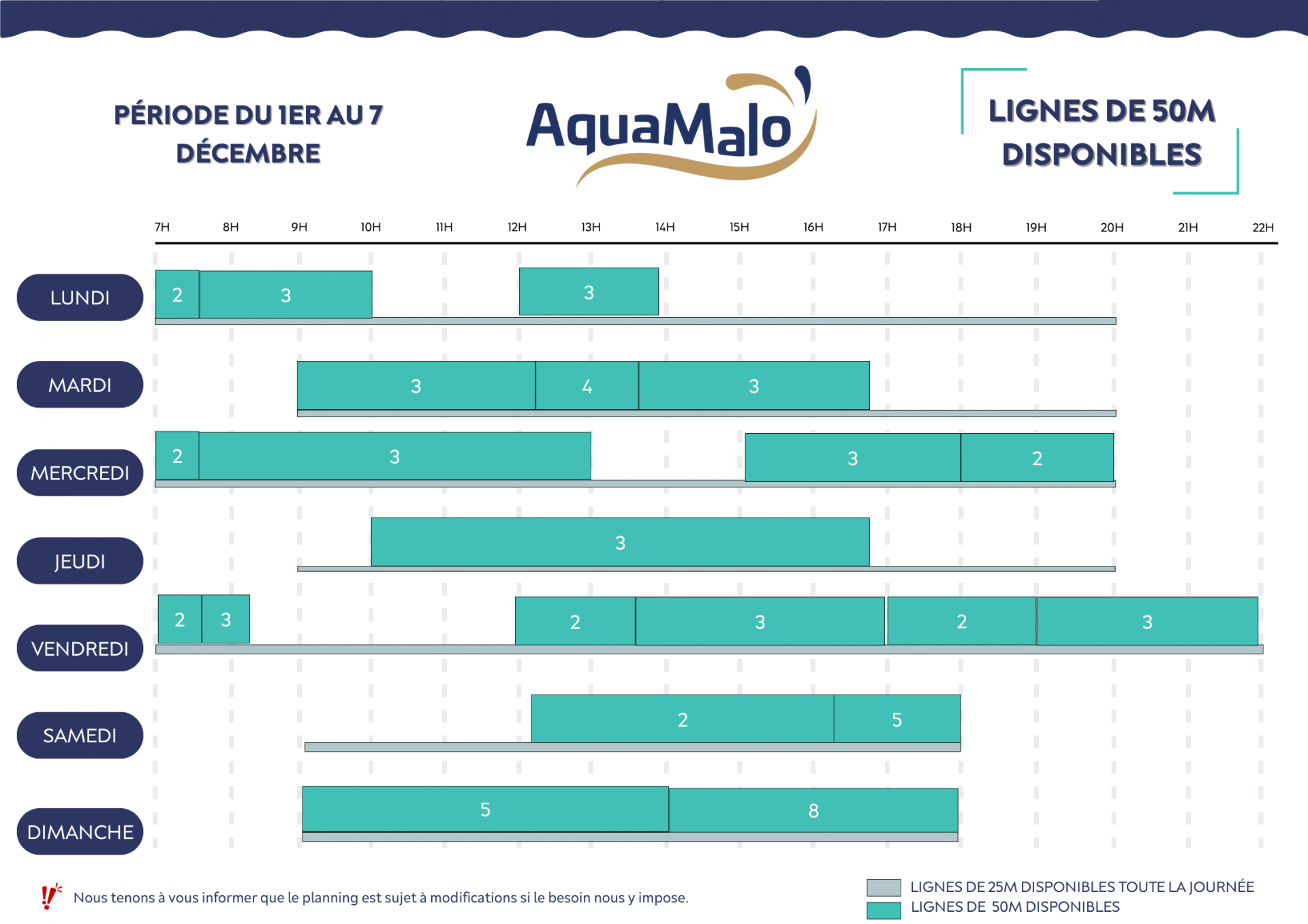 Aquatique : 07:00 - 22:00 | Bien-être : 09:00 - 22:00 | Bassin nordique : 12:00 - 14:00 et 17:00 - 22:00
