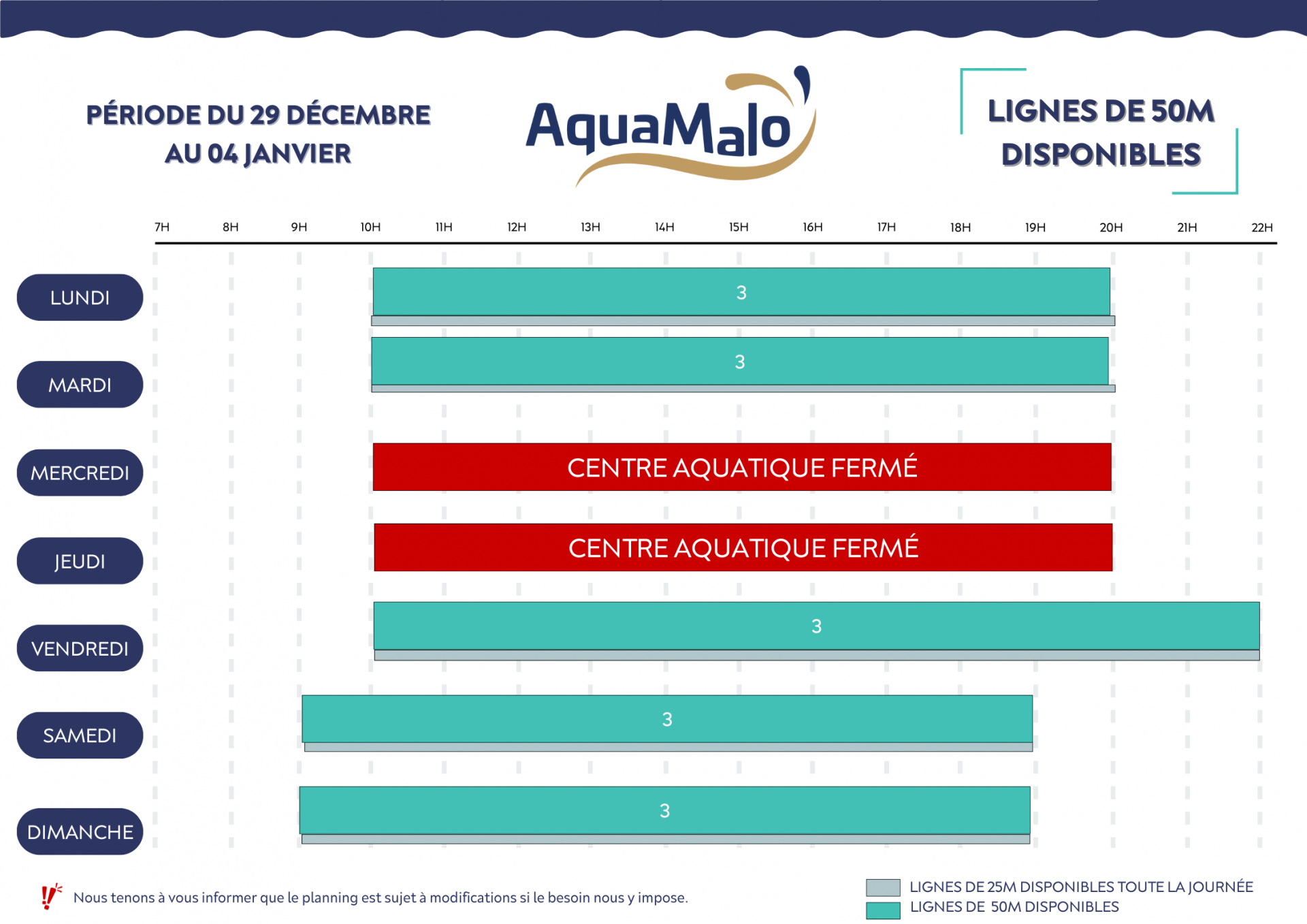 Aquatique : 10:00 - 22:00 | Bien-être : 10:00 - 22:00 | Bassin nordique : 10:00 - 22:00